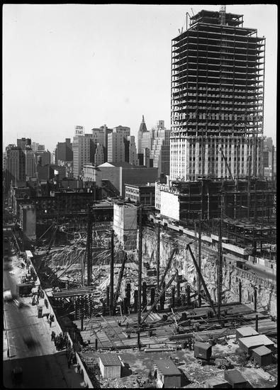 Rockefeller Center and Radio City Music Hall. Construction, steel frame. View from Goelet Building, 608 Fifth Avenue