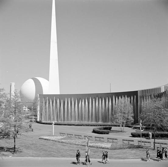 [Grounds of the New York World's Fair, with the Trylon and Perisphere in the background.]
