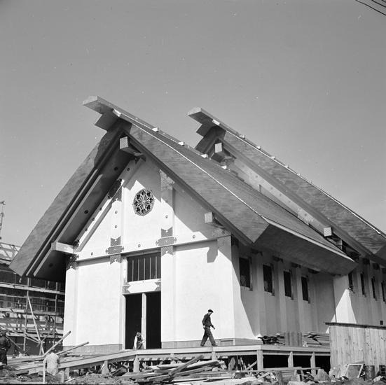 [Chrysler pavilion during construction, New York World's Fair site.]