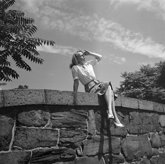 [Young woman sitting on fountain, Venezuelan pavilion.]