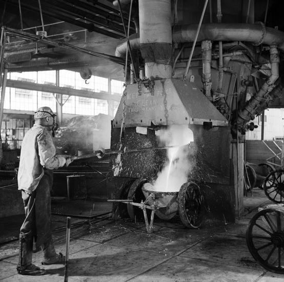 [Interior, manufacturing shop, metal melting furnace oven.]