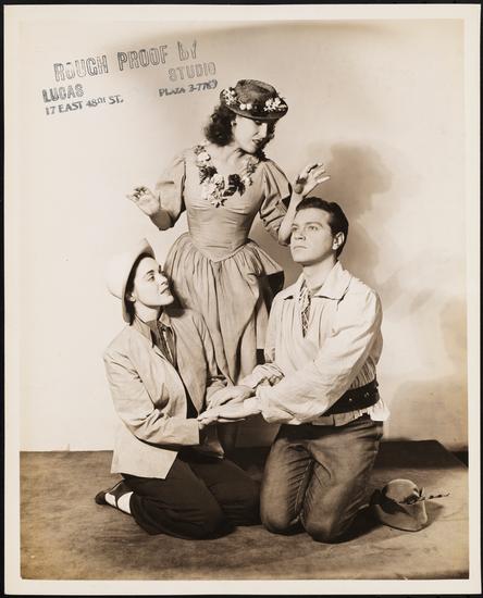 [Carol Stone as Celia, Alfred Drake as Orlando, and Helen Craig as Rosalind in "As You Like It".]