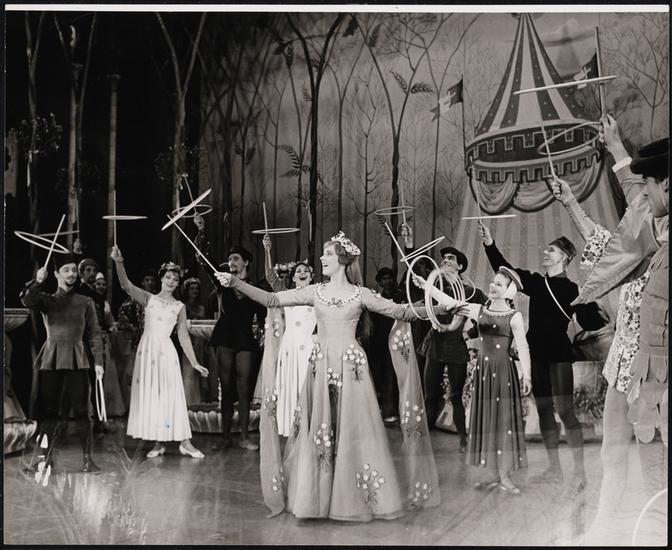 [Julie Andrews as Guenevere and ensemble performing the number "The Lusty Month of May" in Act 1, Scene 5 of "Camelot".]