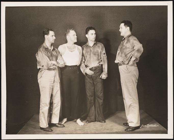 [Corporal Kurt S. Kasznar, Sgt. Gordon B. Thomson, Pvt. Melvin Parks, Cpl. Ralph C. Geisler, and Cpl. David N. Rieser in "First Cousins".]
