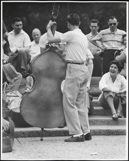 Woman in plaid skirt watching banjo player, fountain steps, Washington Square Park