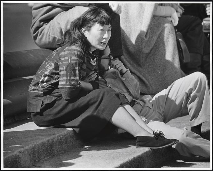Woman in plaid skirt and sunglasses looking toward photographer, fountain steps, Washington Square Park