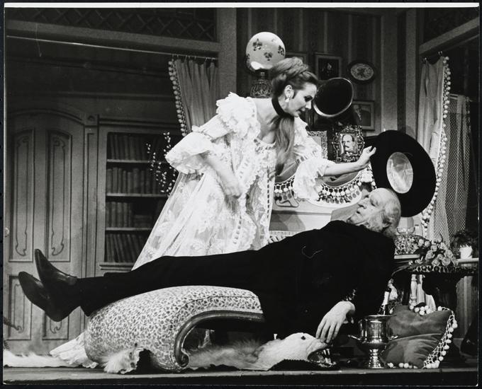 [Inga Swenson as Irene Adler and Fritz Weaver as Sherlock Holmes (in disguise) in "Baker Street".]