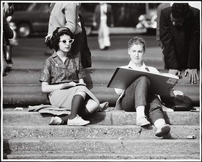 Barefoot girls with sunglasses on fountain steps, Washington Square Park