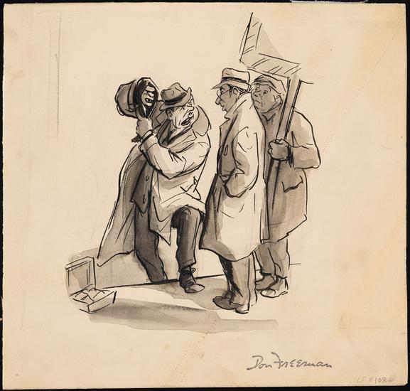 Don Freeman's Newsstand [Two men carrying shovels.]