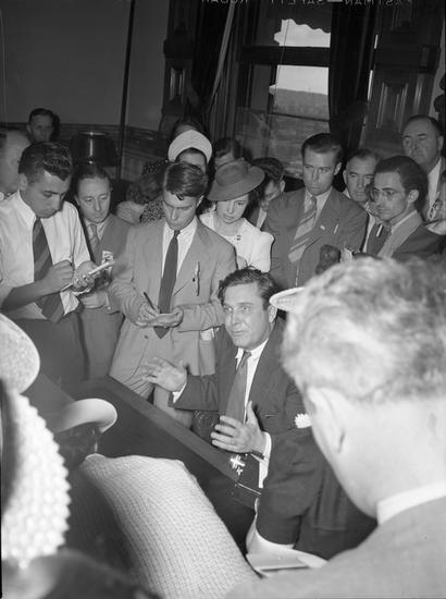 [Al Smith at a Democrats-for-Willkie booth.]