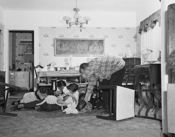 The Durham family of Brooklyn, New York practices civil defense drills. Date of assignment February 9 and 15, 1951.