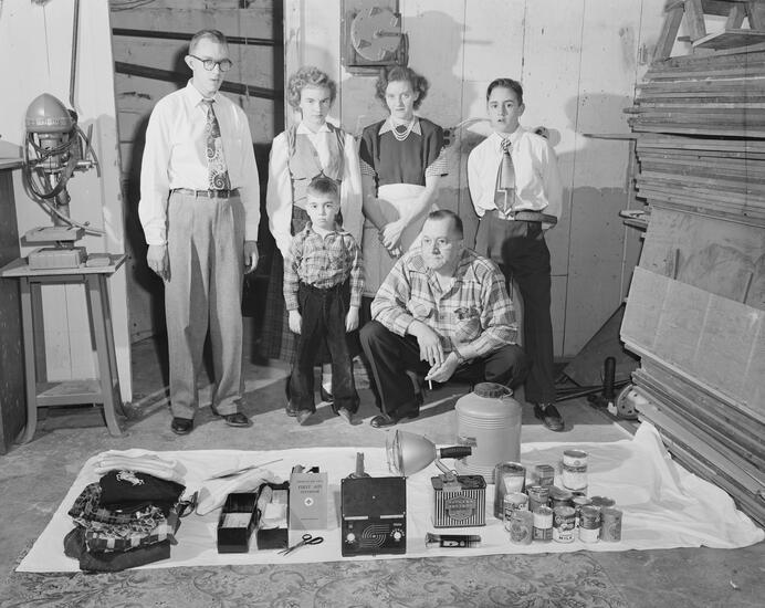 Civil Defense - Atomic Bomb First Aid [The Durham family in the basement of their residence at 4007 Glenwood Road.]