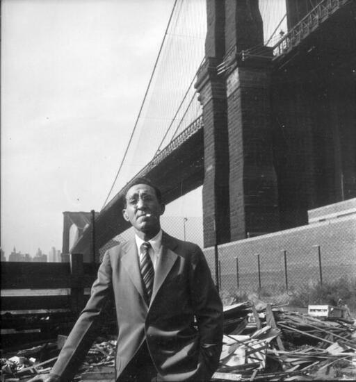 Portraits of writer S.J. Perelman standing under the Brooklyn Bridge with the Manhattan skyline in the distance. Date of assignment October 8, 1949. Contact print frames: 6