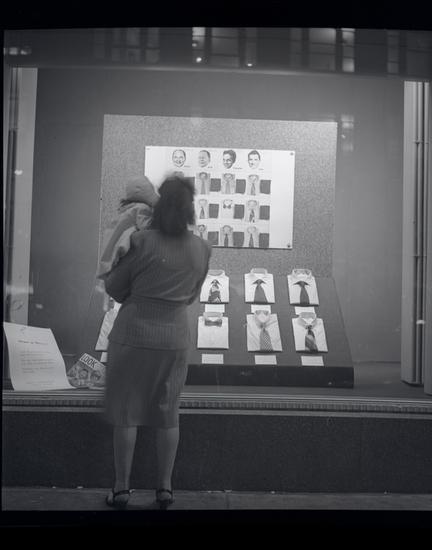 Abraham Strauss [Woman looking at shirts in a window display.]