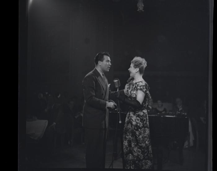 [Hildegarde shaking hands with an unidentified man on a train.]