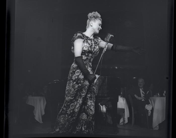 [Hildegarde shaking hands with an unidentified man on a train.]