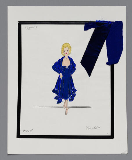 Description 102-E. Costume sketch & swatches of girl in navy dress and chiffon stole with fringe.