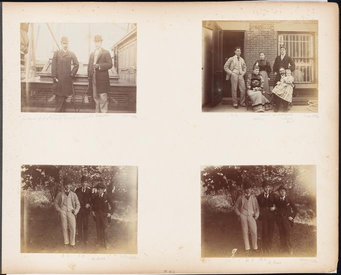 C. & T. Tier & a friend on Pier 5 E.R.; Tom Tier and my self on Pier 5, E.R.; [Dog on a chair; men standing in front of Mones & Co. at 85 Front Street; woman with an umbrella on a roof.]
