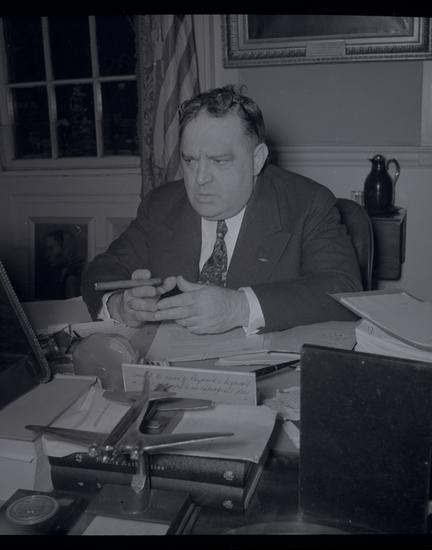Laguardia, Mayor [Mayor La Guardia putting on his jacket in an office.]