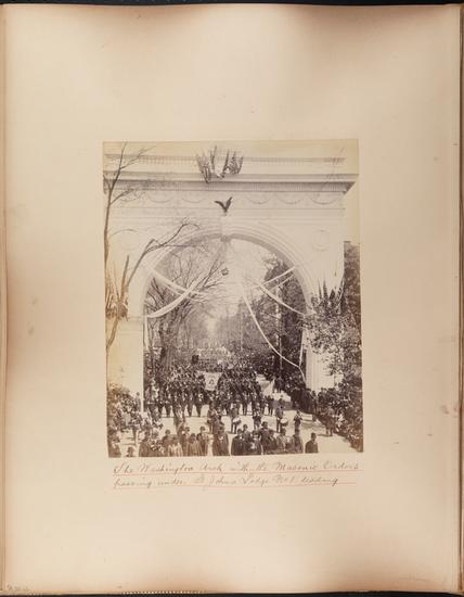 Caledonian Society & the Old Continentals under Washington Arch 5th Av & Waverly Place [Washington's Centennial Parades.]
