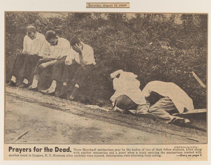[Norris Fay, a survivor, receives first aid as the third passenger coach is seconds away from plunging into water during the aftermath of the Newark Bay rail accident.]