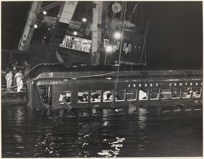 [Norris Fay, a survivor, receives first aid as the third passenger coach is seconds away from plunging into water during the aftermath of the Newark Bay rail accident.]
