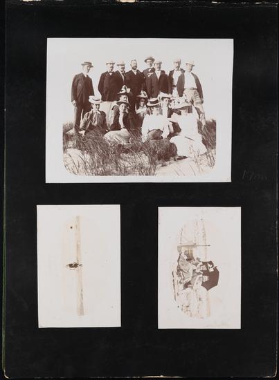 Beach scenes [Three group portraits at beach; men playing baseball.]