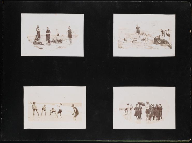 Beach scenes [Group portrait at a beach; men playing baseball; elaborate tent on the beach.]