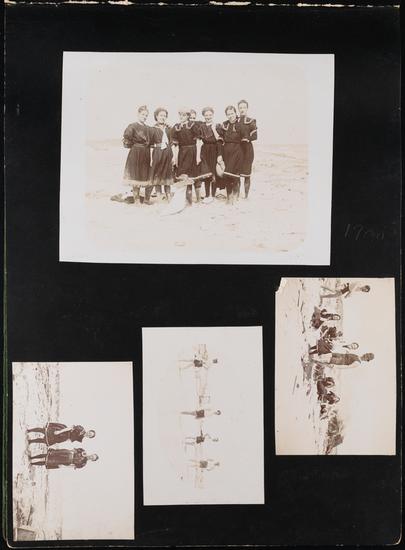 Beach scenes [Three group portraits at beach; men playing baseball.]