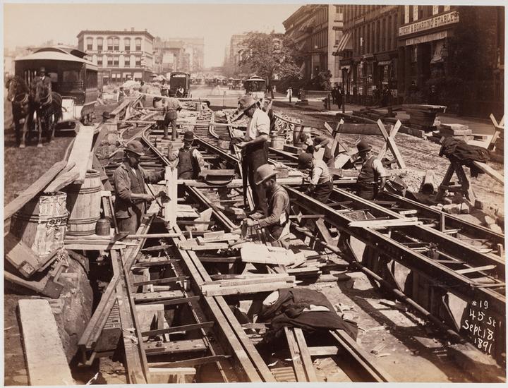 Construction of the cable road on Broadway, 1891 [Laying tracks.]