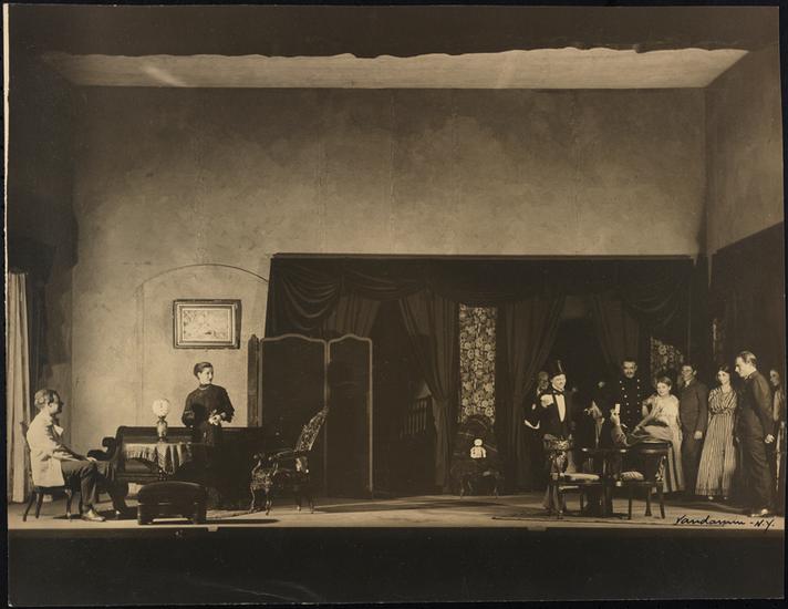 [Donald Cameron as Lopakhin, Ermolai Alekseevich, Alla Nazimova as Ranevskaya, Lyubov Andreevna, and Paul Leyssac as Gayev, Leonid Andreyevich in Act 1 of "The Cherry Orchard".]