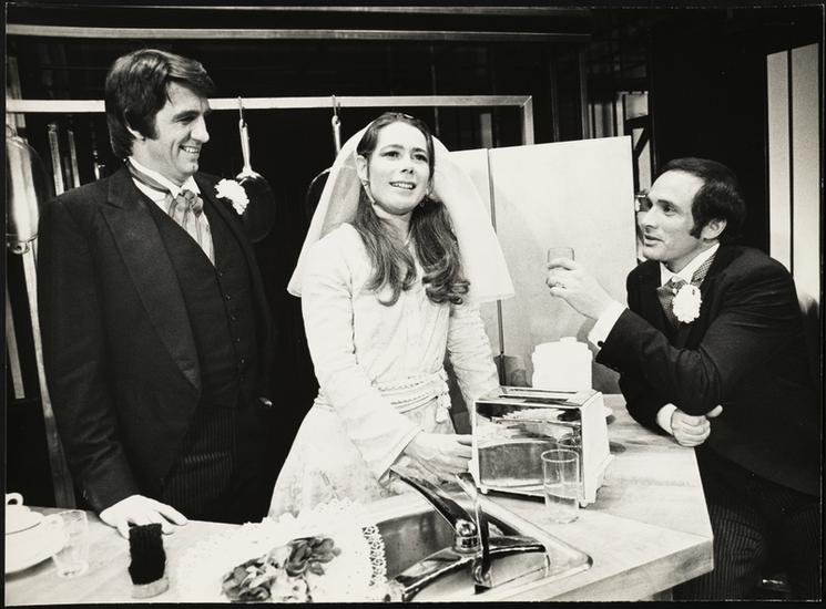 [Cynthia Harris as Sarah, Larry Kert as Robert, and Kenneth Kimmins as Harry in "Company".]