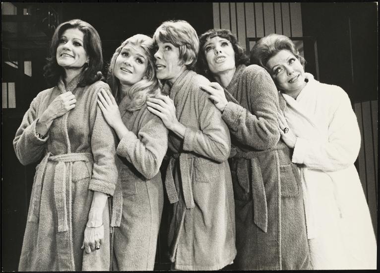 [Barbara Barrie as Sarah, Teri Ralston as Jenny, Merle Louise as Susan, Beth Howland as Amy, and Elaine Stritch as Joanne in "Company".]