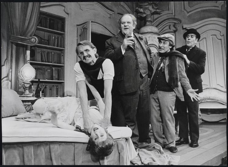 [Jack Weston as Dietrich Merkenschrift, Julie Harris as Gertie Kessel and René Auberjonois as Johann Schiml in "Break a Leg".]