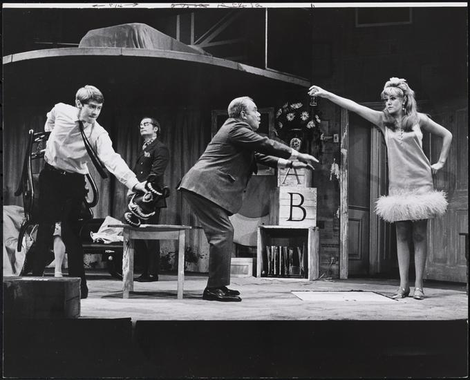 [Michael Crawford as Brindsley Miller and Geraldine Page as Clea in "Black Comedy".]