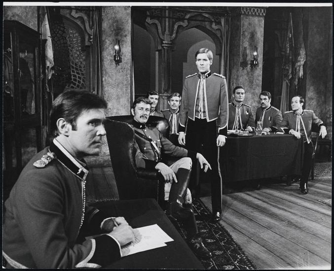 [Michael Barrington as Colonel Strang, Paul Jones as 2nd Lt. Arthur Drake, and Donald Pickering as Capt. Rupert Harper in "Conduct Unbecoming".]