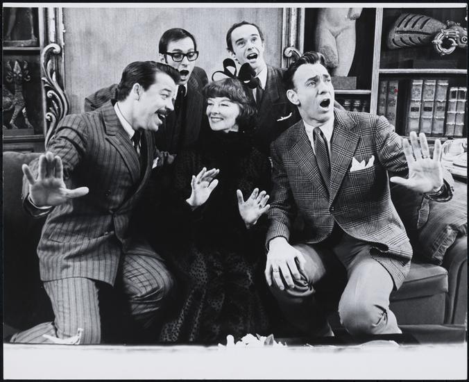 [Katharine Hepburn as Coco Chanel with ensemble in "Coco".]