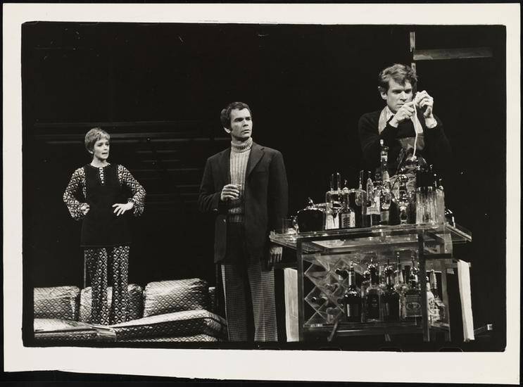 [Barbara Barrie as Sarah, Larry Kert as Robert, and Charles Kimbrough as Harry in "Company".]