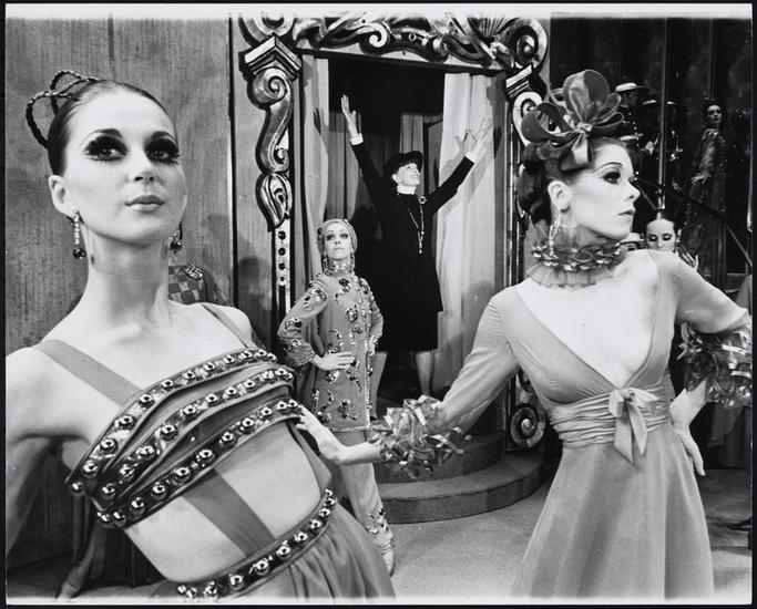[Katharine Hepburn as Coco Chanel with ensemble in "Coco".]