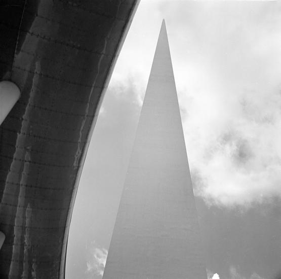 [Looking up at the Trylon, Perisphere and Helicline, New York World's Fair.]