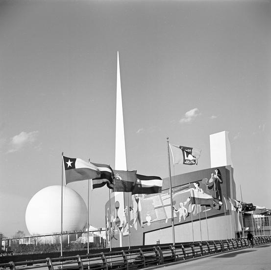 [Grounds of the New York World's Fair, with the Trylon and Perisphere visible.]