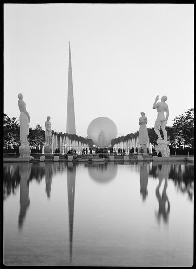 [New York World's Fair. Theme Center, Perisphere, and Trylon with "Four Freedoms" statues.]