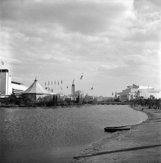 [View across Fountain Lake, showing the Florida pavilion and the Trylon and Perisphere, New York World's Fair.]