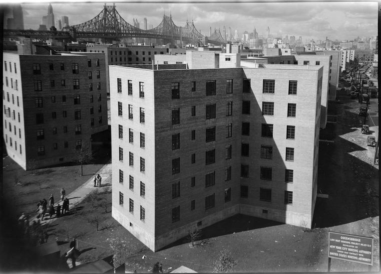 [Queensbridge Houses with Midtown Manhattan in the distance.]