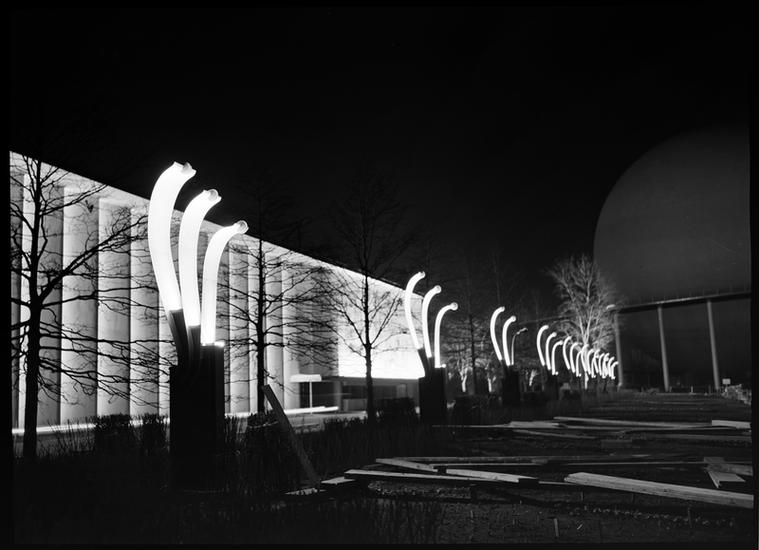 [Night view of the New York World's Fair site under construction.]