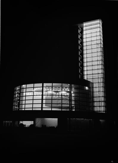 New York Worlds Fair. Operations Building. Night view
