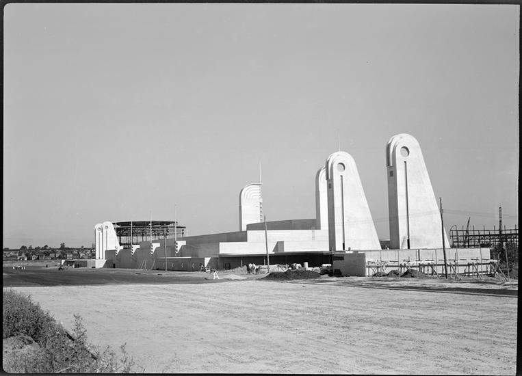 [Chrysler pavilion under construction, New York World's Fair site.]