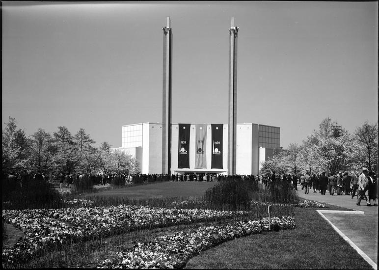 New York Worlds Fair. Communication Building. Elevated view of mall