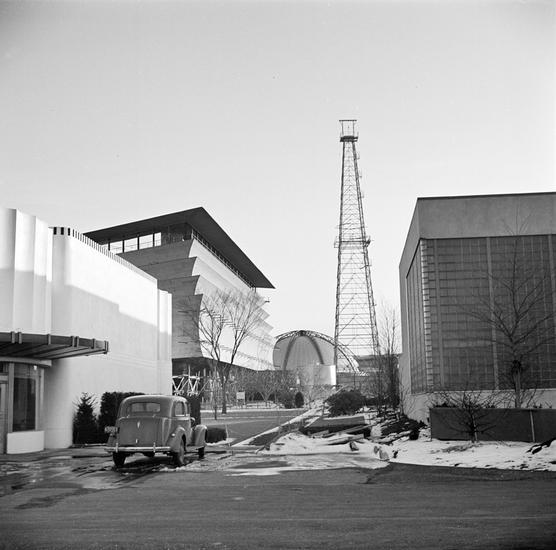 [Production and Distribution Zone with the Trylon visible in the background, New York World's Fair.]