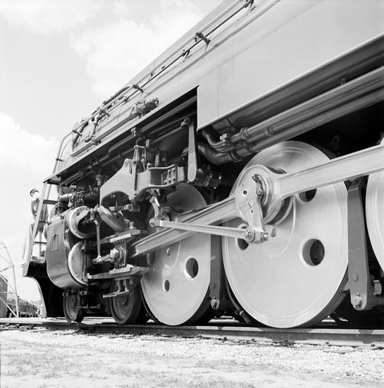[Wheels of the Coronation Scot train on display at the New York World's Fair.]